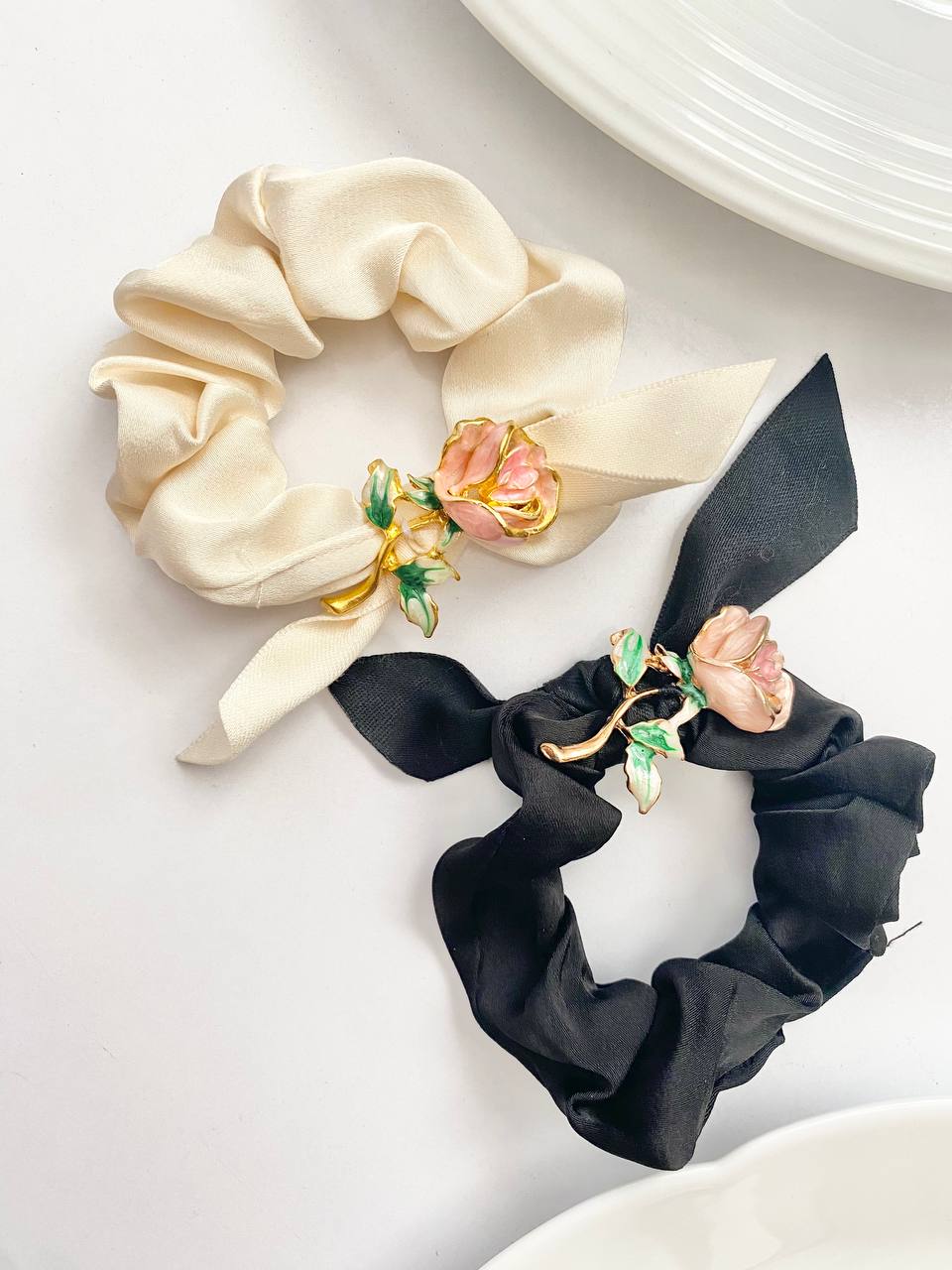 کش اسکرانچی ساتن با گل رز فلزی لوکس